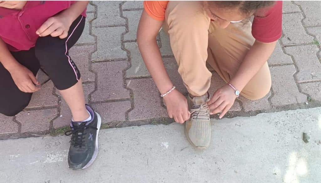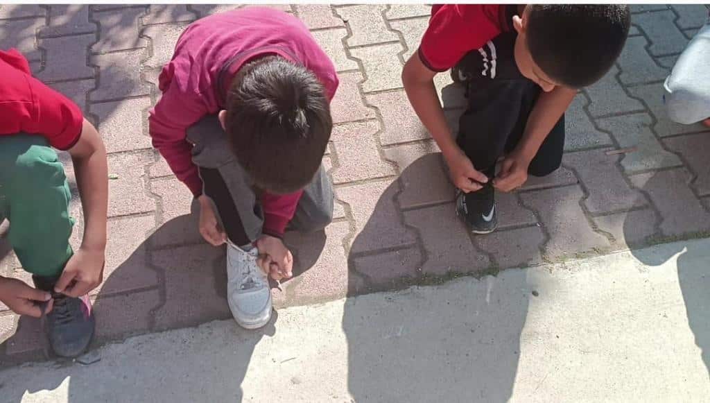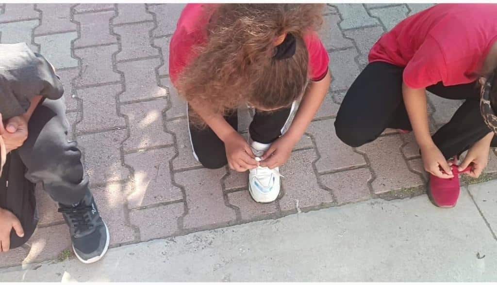Faaliyet: Öğrencilere ayakkabı bağcıklarını bağlama konusunda rehberlik edilir ve bunu denemeleri teşvik edilir.